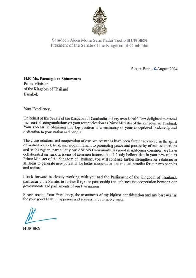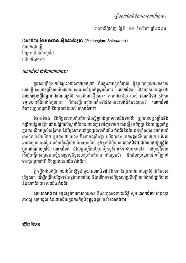 August 16, 2024July 25, 2025 San Chantha សម្តេចតេជោ ហ៊ុន សែន ផ្ញើសារអបអរសាទរជូន លោកស្រី Paetongtarn ដែលត្រូវបានតែងតាំងជា នាយករដ្ឋមន្ត្រីថ្មីរបស់ថៃ Share this: Share on X (Opens in new window) X Share on Facebook (Opens in new window) Facebook Like Loading... Related
