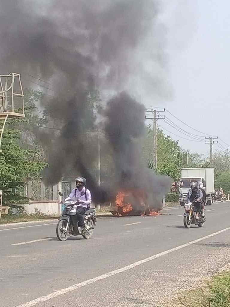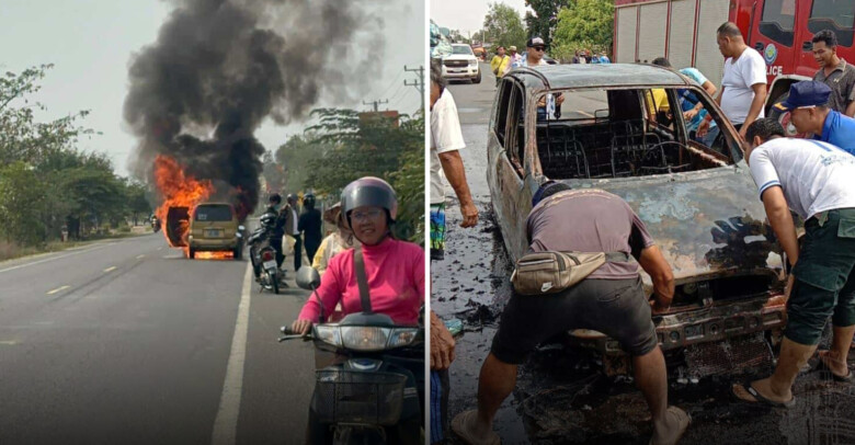 ខេត្តស្វាយរៀង ៖ រថយន្តមួយគ្រឿង ខណៈកំពុងតែបើកបរនៅលើដងផ្លូវ ត្រូវអណ្តាតភ្លើងឆាបឆេះយ៉ាងសន្ធោសន្ធៅ រហូតអស់សល់តែគ្រោងឆ្អឹង ។