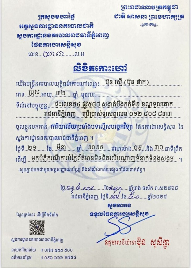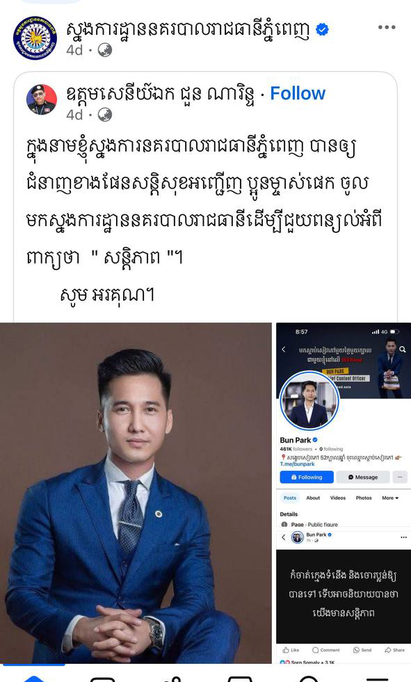 លោកវរសេនីយ៍ឯក សំ វិច្ឆិកា បន្តថា ពាក់ពន្ធករណីនេះ បុរសរូបនេះ នៅព្រឹកមិញ គឺវេលាម៉ោង០៩និង៣០នាទីថ្ងៃទី២១ ខែមីនា ឆ្នាំ២០២៥ បានចូលខ្លួនទៅតាមពេលវេលា នៃការកោះអញ្ជើញរបស់ស្នងការដ្ឋាននគរបាលរាជធានីភ្នំពេញ ហើយបានជួបជាមួយនឹងមន្ត្រីជំនាញ នៃស្នងការដ្ឋាននគរបាលរាជធានីភ្នំពេញ ហើយយើងធ្វើការសួរនាំ អំពីខ្លឹមសារ ដែលគាត់បានបង្ហោះផ្សព្វផ្សាយលើបណ្តាញសង្គមពាក់ពន្ធ និងហៅថា ពាក្យសន្តិភាព ។