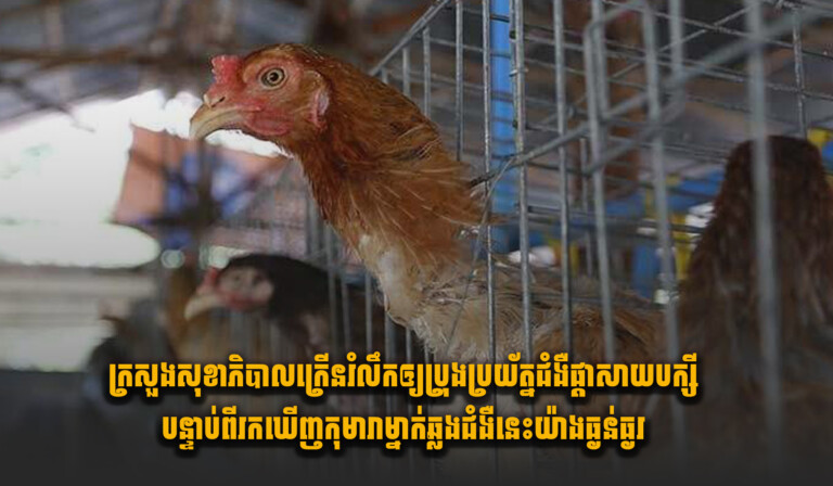 រាជធានីភ្នំពេញ ៖ ក្រសួងសុខាភិបាល បានក្រើនរំលឹកសារជាថ្មីម្តងទៀត ដល់ប្រជាពលរដ្ឋទាំងអស់យកចិត្តទុកដាក់ប្រុងប្រយ័ត្នលើជំងឺផ្តាសាយបក្សីជានិច្ច បន្ទាប់ពីរកឃើញកុមារាម្នាក់ នៅខេត្តក្រចេះបានឆ្លងជំងឺផ្តាសាយបក្សីនេះយ៉ាងធ្ងន់ធ្ងរ ។