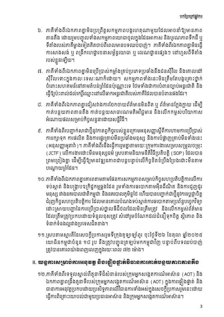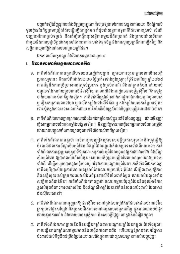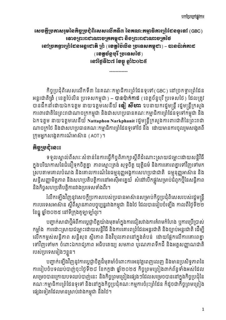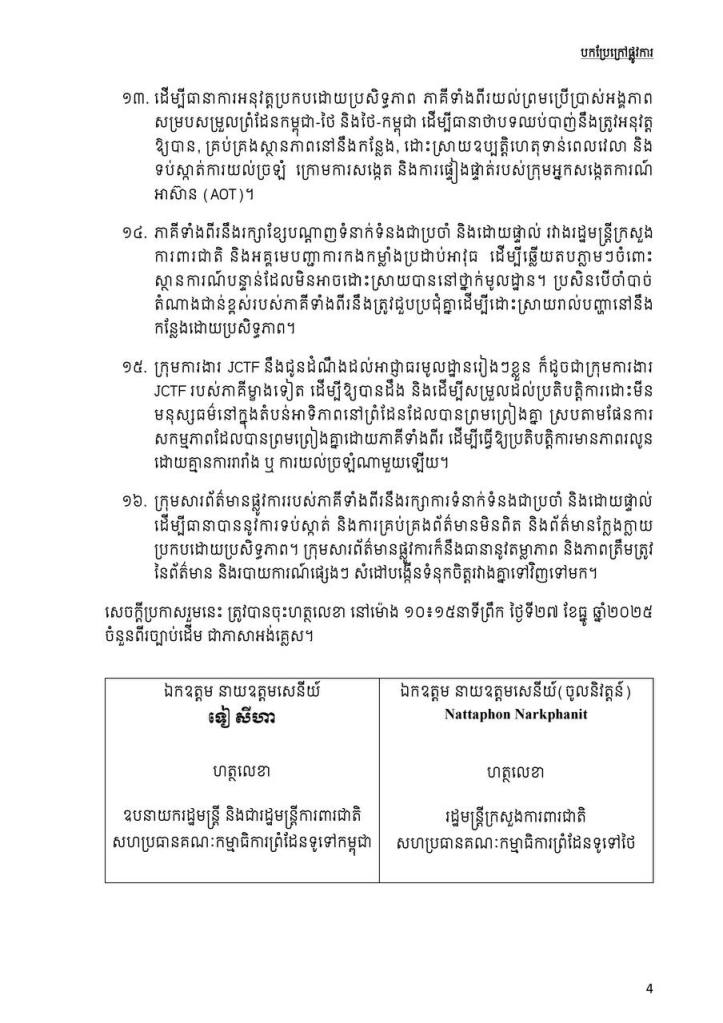ឯកឧត្តម ប៉ែន បូណា អ្នកនាំពាក្យរាជរដ្ឋាភិបាលកម្ពុជា ៖ កម្ពុជាគោរពស្មារតីនៃសេចក្តីប្រកាសរួមថ្ងៃទី២៧ ខែធ្នូ ឆ្នាំ២០២៥ ដែលចែងថា ភាគីទាំងពីរឯកភាពគ្នាប្រគល់តួនាទីឱ្យគណៈកម្មការចំរុះព្រំដែនបន្តអនុវត្តការងារវាស់វែង និងខ័ណ្ឌសីមាព្រំដែនឱ្យបានឆាប់រហ័សបំផុត ស្របតាមកិច្ចព្រមព្រៀងដែលមានស្រាប់រវាងប្រទេសទាំងពីរដើម្បីសម្រេចបាននូវសន្តិភាពយូរអង្វែងតាមបណ្តោយព្រំដែន។ ភាគីថៃក៏បានអះអាងថា ខ្លួនគោរពស្មារតីនៃសេចក្តីប្រកាសរួមនេះដូចគ្នា។ ដូច្នេះ ដំណោះស្រាយដែលស្របតាមច្បាប់អន្តរជាតិនឹងកើតមាននៅពេលខាងមុខ។ សូមជនរួមជាតិយើងទុកចិត្តលើរាជរដ្ឋាភិបាលនិងថ្នាក់ដឹកនាំរបស់យើងក្នុងការដោះស្រាយបញ្ហានេះ៕