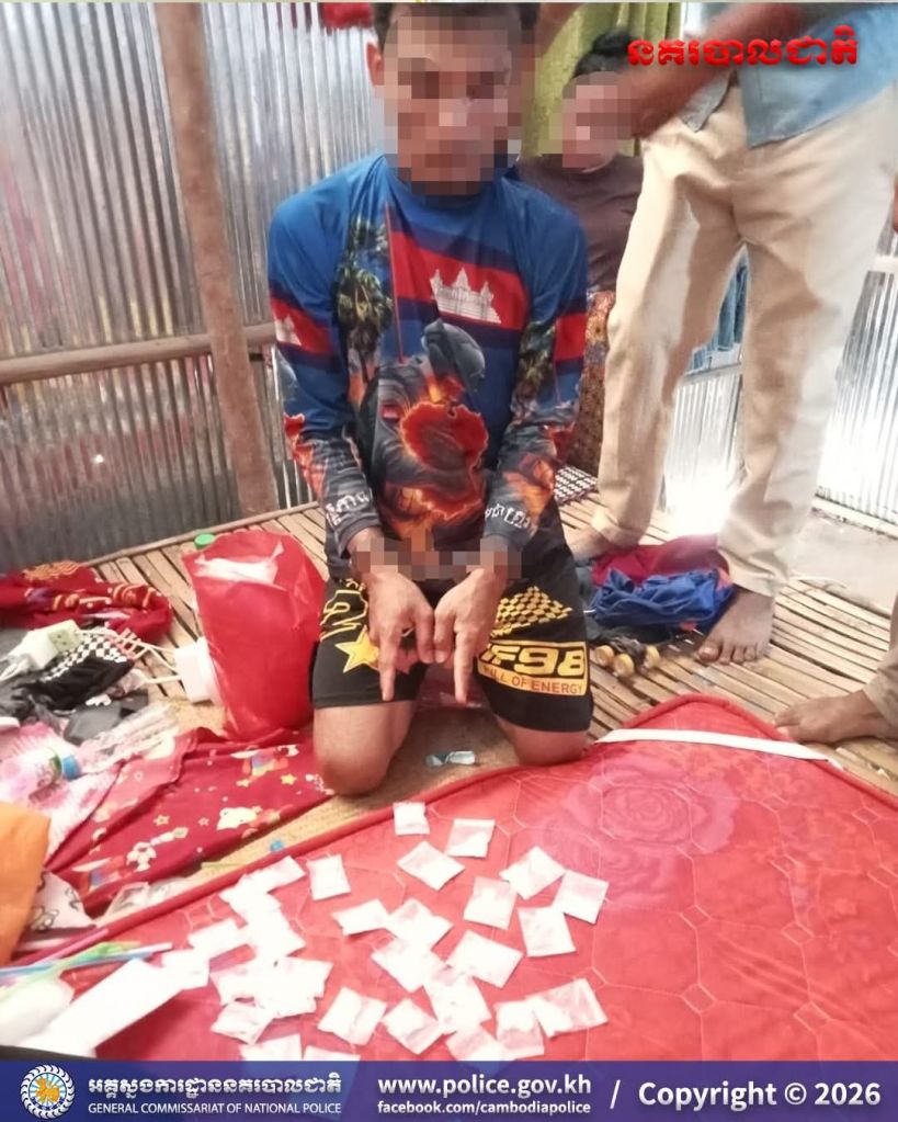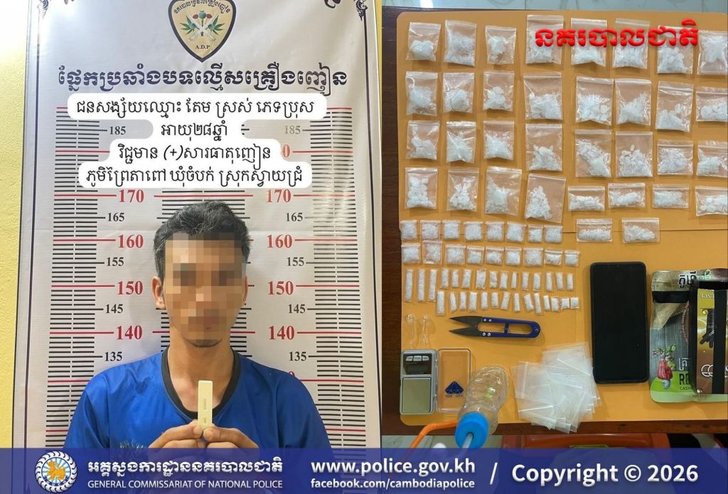 ស្វាយរៀង៖ ព្រឹកថ្ងៃទី២៥ ខែមេសា ឆ្នាំ២០២៦ វេលាម៉ោង ១០:៥០នាទី ដោយអនុវត្តតាមបទបញ្ជាដ៏ខ្ពង់ខ្ពស់របស់ លោកឧត្តមសេនីយ៍ទោ ពេជ្រ វីរៈ ស្នងការនគរបាលខេត្តស្វាយរៀង ដោយមានការដឹកនាំបញ្ជាផ្ទាល់ពី លោកវរសេនីយ៍ឯក សោម សុភ័ណ្ឌ អធិការនគរបាលស្រុកស្វាយជ្រំ កម្លាំងជំនាញអធិការដ្ឋាននគរបាលស្រុកស្វាយជ្រំ ឃាត់ខ្លួនជនសង្ស័យ ០១នាក់ ពាក់ព័ន្ធករណីជួញដូរគ្រឿងញៀនខុសច្បាប់ នៅឃុំចំបក់ ស្រុកស្វាយជ្រំ។