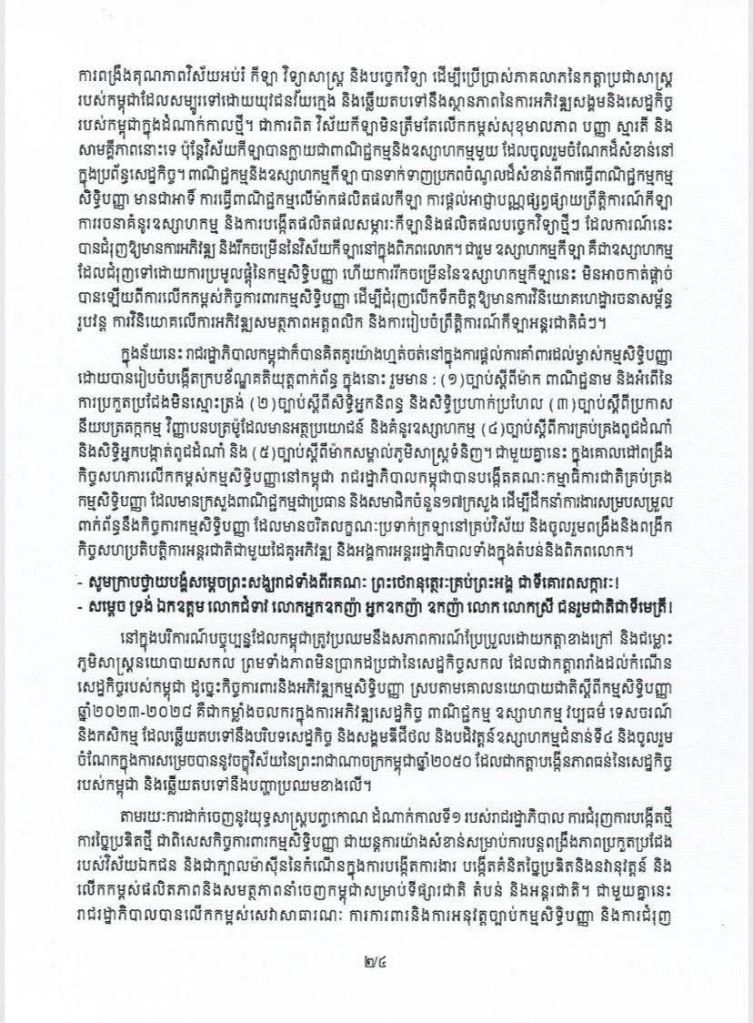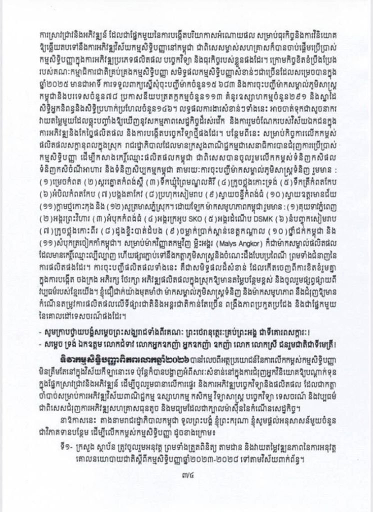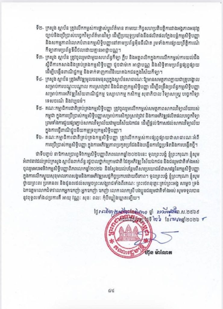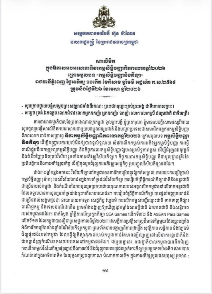 April 26, 2026 San Chantha សម្តេចមហាបវរធិបតី ហ៊ុន ម៉ាណែត នាយករដ្ឋមន្ត្រី នៃព្រះរាជាណាចក្រកម្ពុជា ចេញសារលិខិតក្នុងឱកាសអបអរសាទរទិវាកម្មសិទ្ធិបញ្ញាពិភពលោកឆ្នាំ២០២៦ ក្រោមមូលបទ «កម្មសិទ្ធិបញ្ញានិងកីឡា” Share this: Share on X (Opens in new window) X Share on Facebook (Opens in new window) Facebook Like Loading... Related