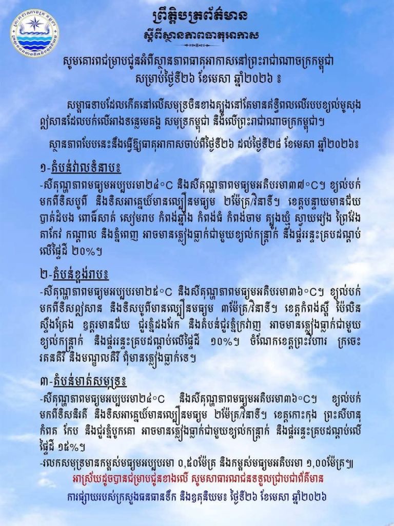 ស្ថានភាពបែបនេះនឹងធ្វើឱ្យ ចាប់ពីថ្ងៃទី២៦ ដល់ថ្ងៃទី២៨ ខែមេសា ឆ្នាំ២០២៦៕