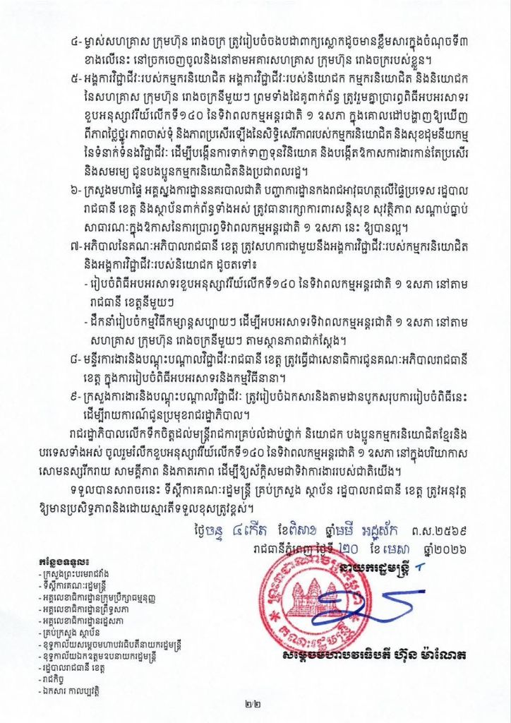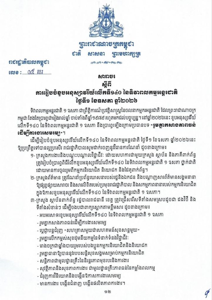 April 27, 2026 San Chantha សារាចរ ស្តីពី ការរៀបចំខួបអនុស្សាវរីយ៍លើកទី១៤០ នៃទិវាពលកម្មអន្តរជាតិ ថ្ងៃទី១ ខែឧសភា ឆ្នាំ២០២៦ Share this: Share on X (Opens in new window) X Share on Facebook (Opens in new window) Facebook Like Loading... Related